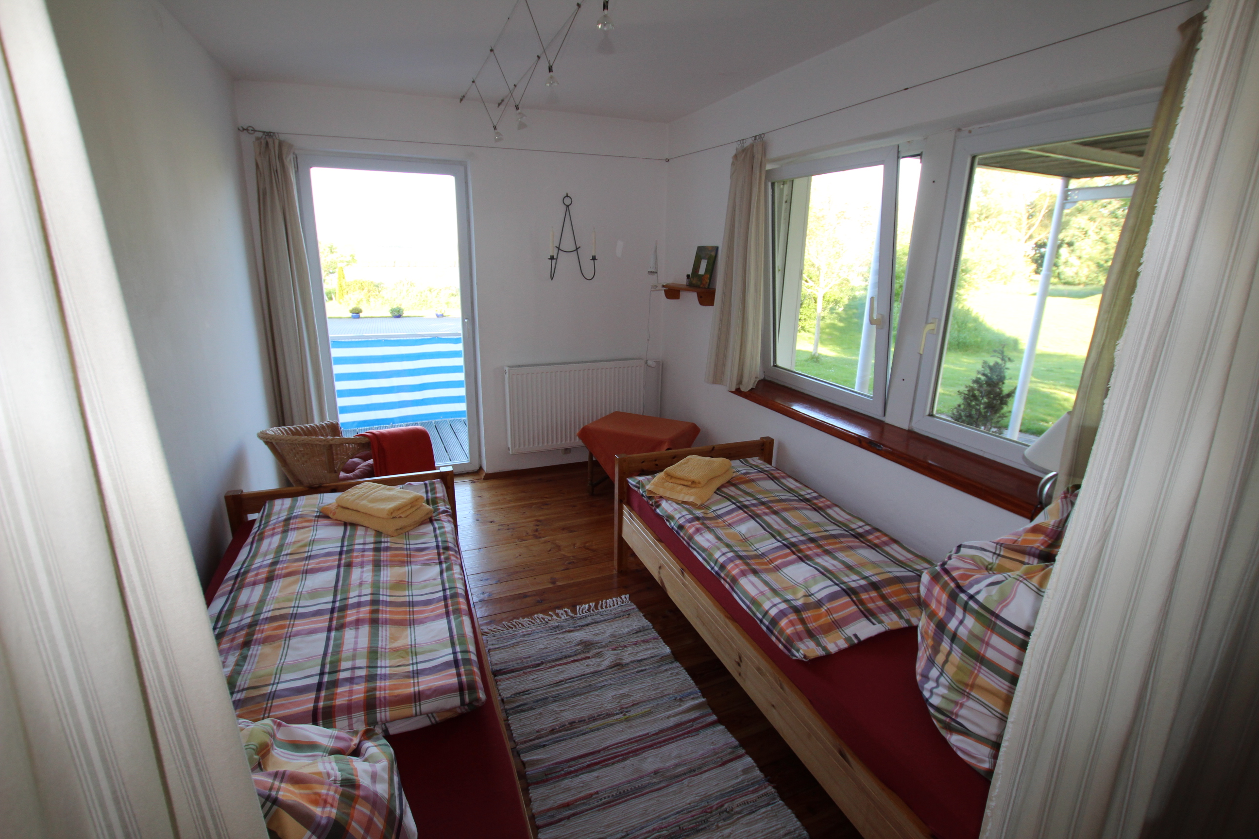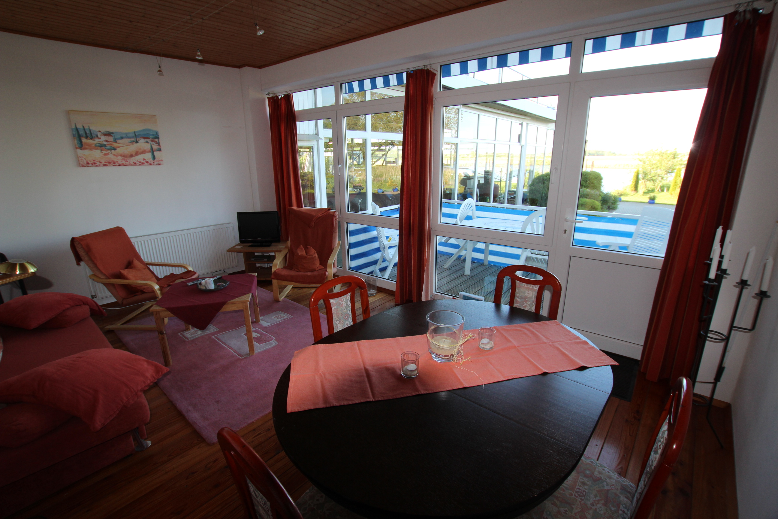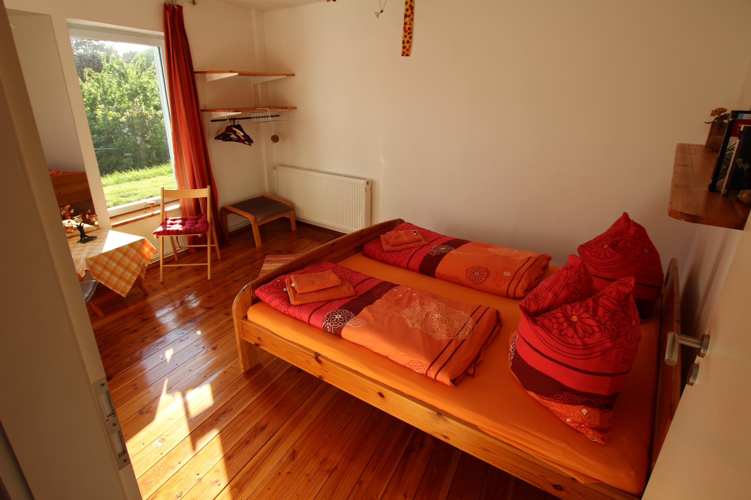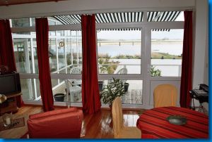 Die Wohnung hat zwei Doppelzimmer, eins mit einem Doppelbett, das andere mit zwei Einzelbetten. Ein weiteres Bett kann nach Absprache aufgestellt werden. Vom Schlafzimmer mit den beiden Einzelbetten aus hat man vom Bett aus den Blick aufs Wasser und Zugang zur Terrasse und einen eigenen Eingang. Das andere Schlafzimmer liegt nach Südwesten zur Landseite auf den Deich. Vom Wohnraum haben Sie ebenfalls einen wunderschönen Blick auf die Flusslandschaft und direkten Zugang auf die Terrasse und das Gelände. So können Sie vom gemütlichen Sofa oder vom Essplatz aufs Wasser schauen. Die Markise über der Terrasse schützt Sie bei Bedarf vor der Sonne. Direkt neben der Wohnung erstreckt sich eine große Grünfläche, die zum Picknicken am Flussufer oder Ballspielen einlädt.