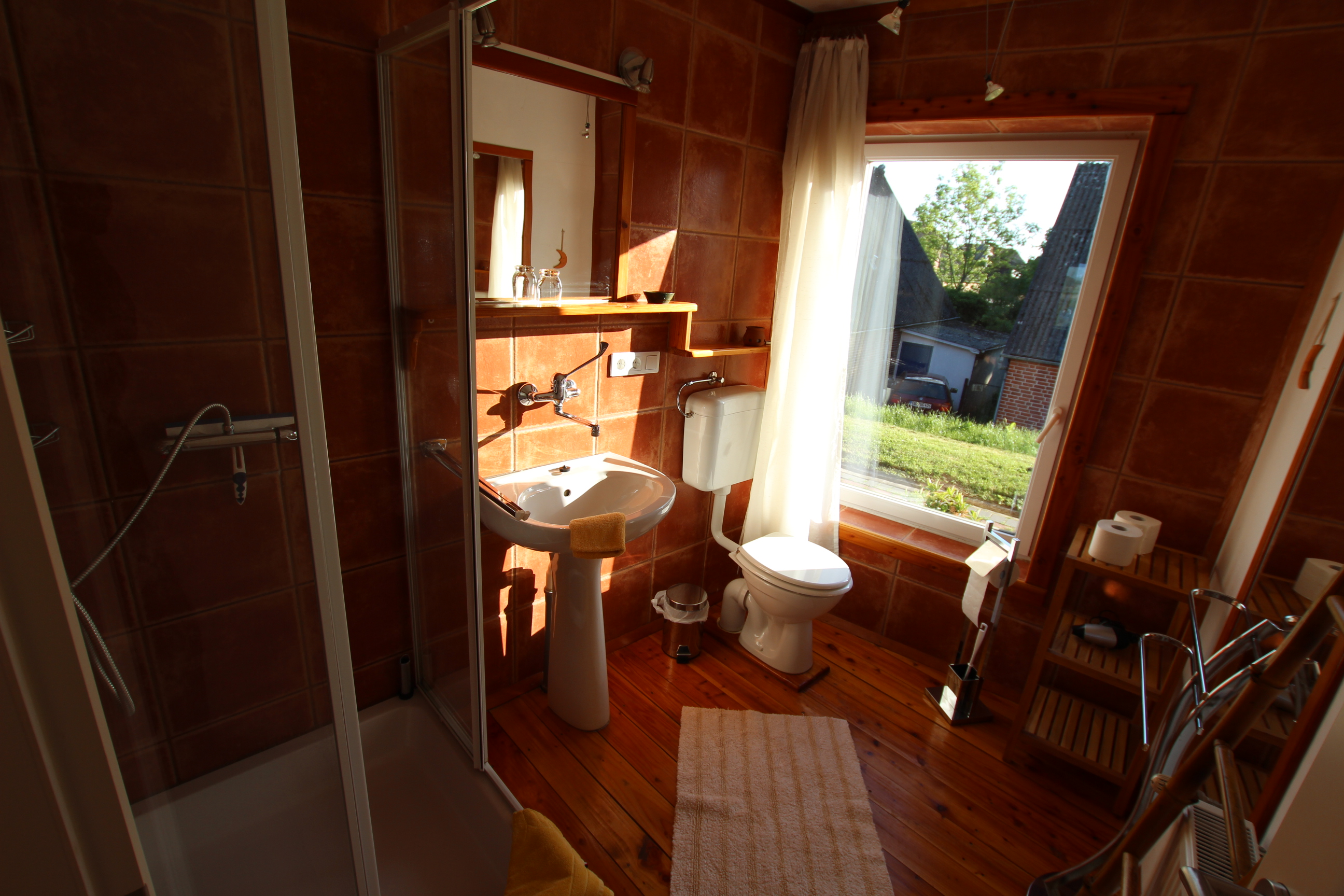 Der Holzdielenboden und das Interieur verleihen ihr einen warmen Charakter. Das Dusch-Bad und die Küche sind mit Terrakottafliesen ausgestattet und haben so einen kuscheliges, mediterranes Flair. Die lichtdurchflutete Küche ist mit Cerankochfeld, Backofen, Mikrowelle, Spülmaschine und Gefrierkombi ausgerüstet. In der Küche befindet sich ein gemütlicher Frühstücksplatz.